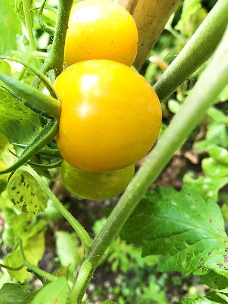 我剛才走到後院摘蕃茄。哇!自己種的有機番茄又大又甜。感恩