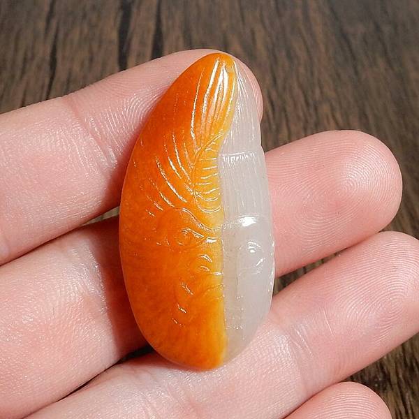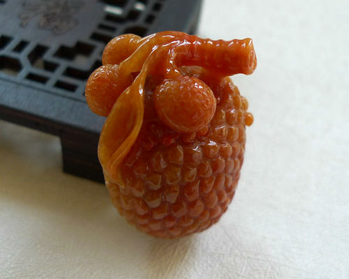 一騎紅塵妃子笑,無人知是荔枝來。這件三彩玉的作品雕刻的就是荔枝,荔枝露出了垂延欲滴的果肉,讓人有一種想吃的衝動。荔枝的外形很美豔,就連荔枝外皮那坑坑窪窪的感覺都已經雕刻出來了。