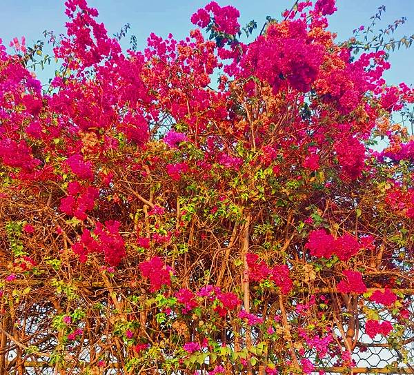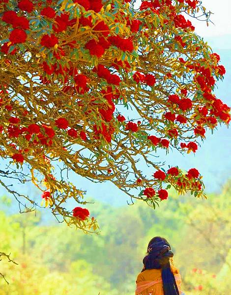 仰望天空賞花樹,掛滿紅花如愛心,生命之花宇宙光,美好希望相呼應❤
